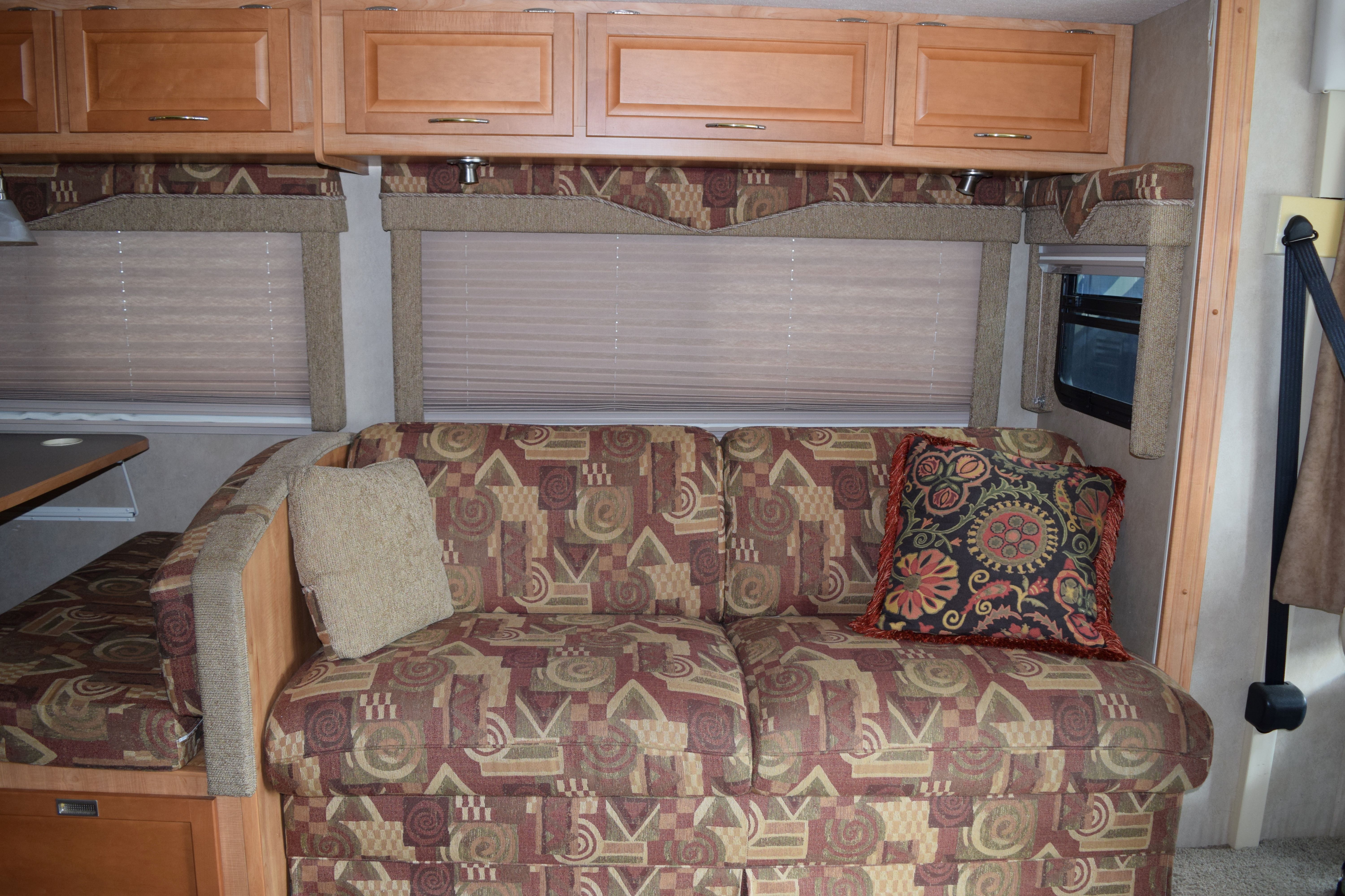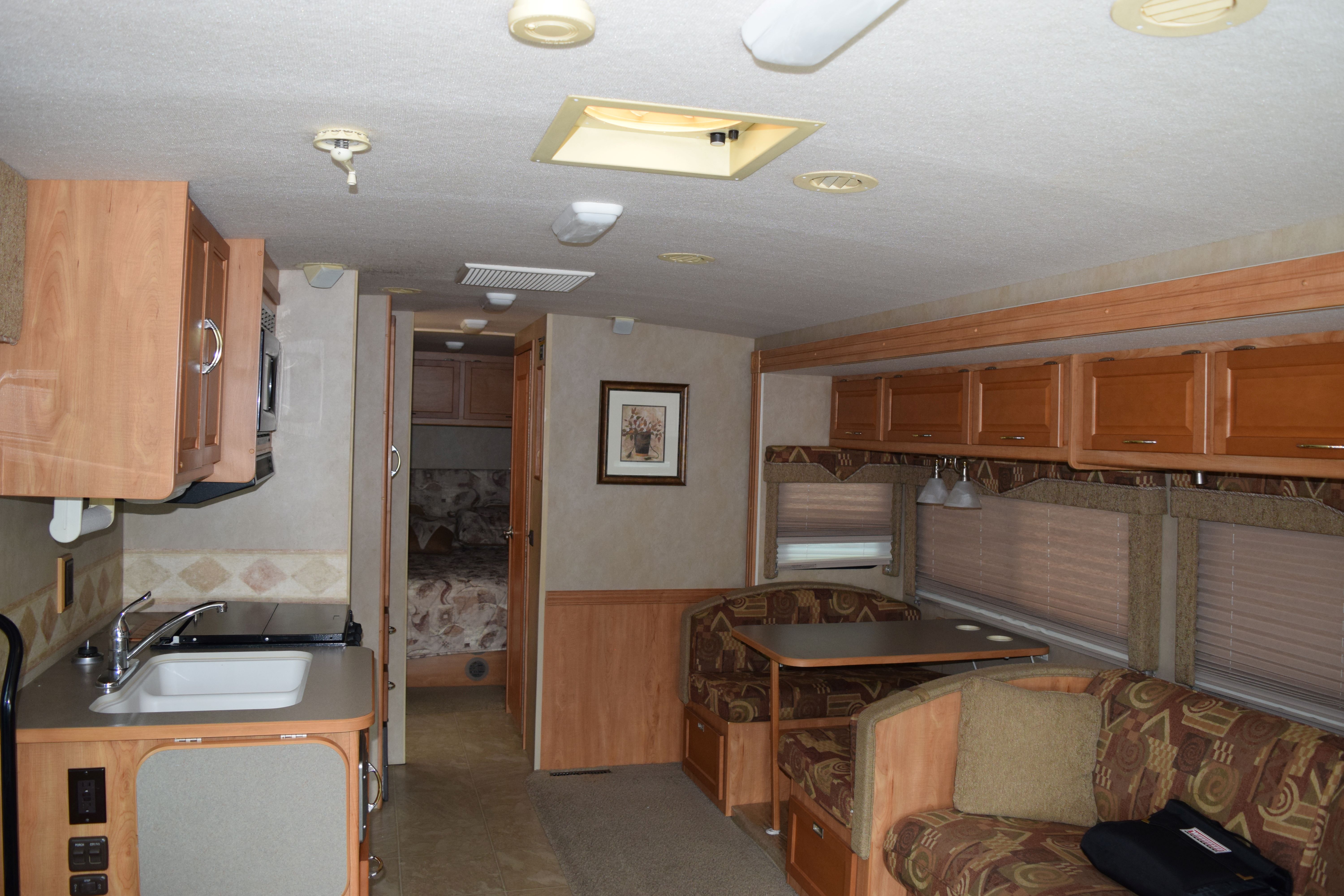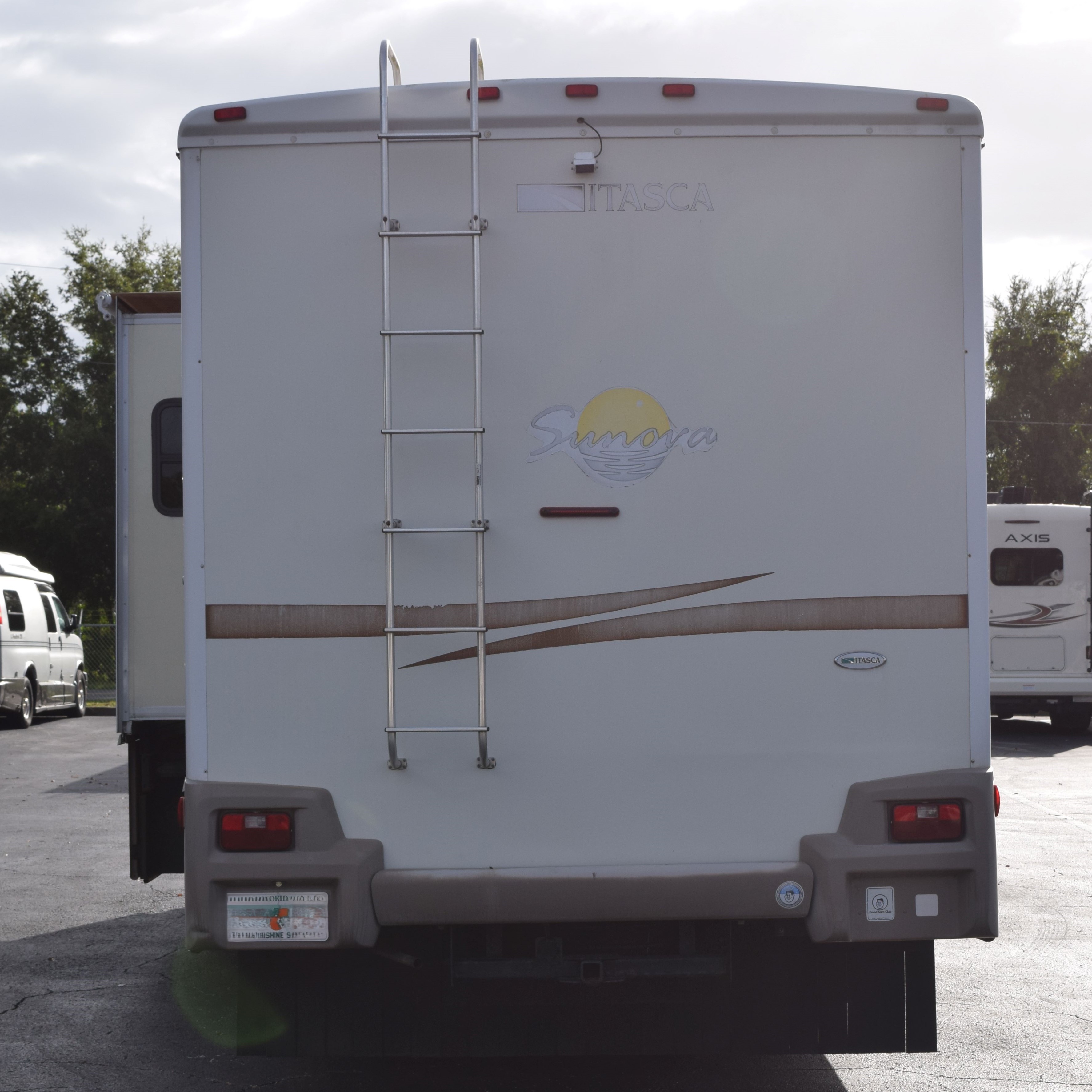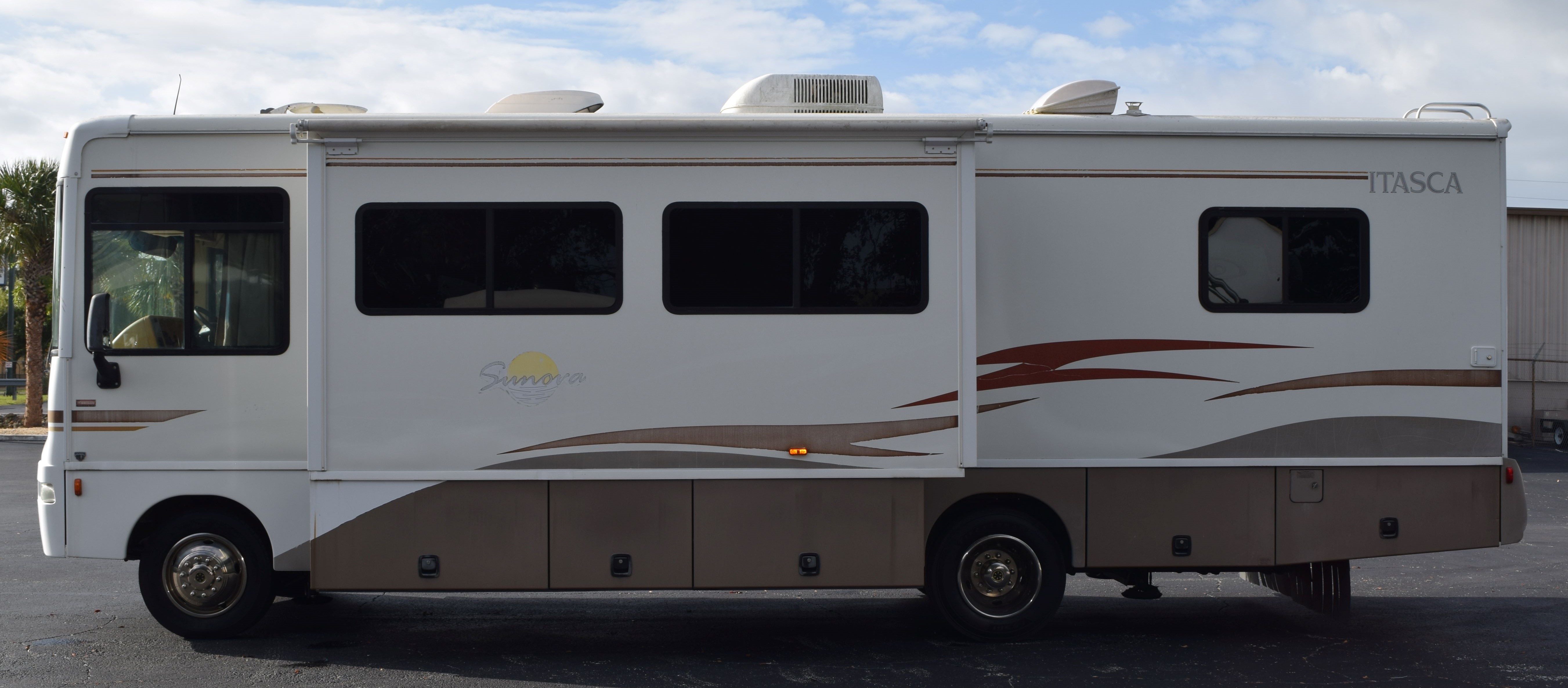 This 2006 Itasca Sunova (M-30B Ford) is the perfect coach for you! At 31ft and 81,200 miles, this unit can sleep between 2-4 people. The living area holds a lazyboy-style recliner and large couch that can be converter into a sleeping area. The bench-style dinette can also be converter into a bed. The kitchen is stocked with tons of storage space, large double sink, folding counter for additional counter space, 4-burner stovetop/oven combo, microwave, and 2-door Norcold fridge/freezer combo. The split bath separates the living area from the main bedroom. The main bedroom houses a queen-size bed and plenty of closet space. The coach is also equipped with a Coleman rooftop A/C, water heater, furnace, manual patio awning, one slide topper, powered leveling system, back up camera system, and onboard generator. Come by to see this unit for yourself, or call with any questions. 352-589-4422