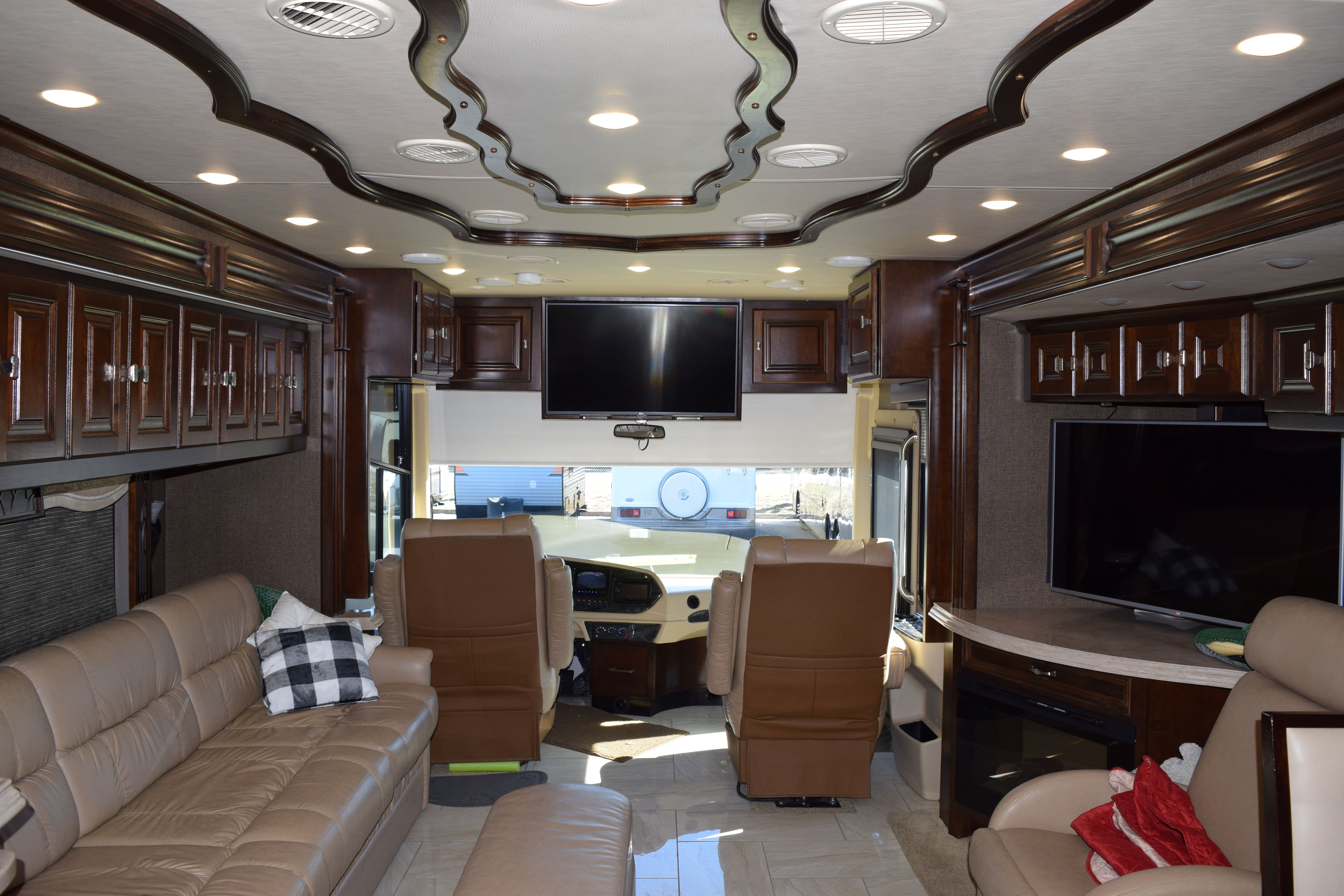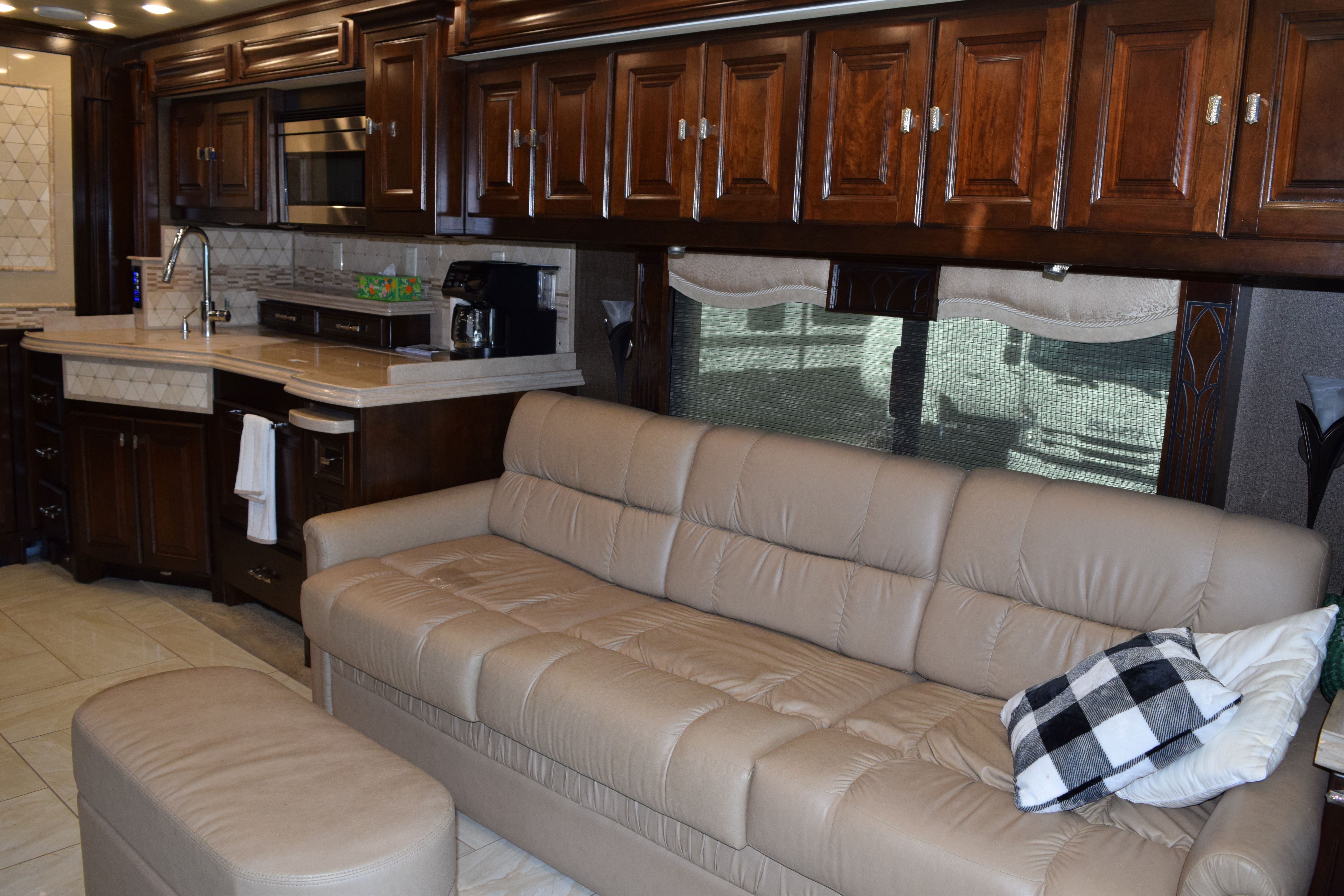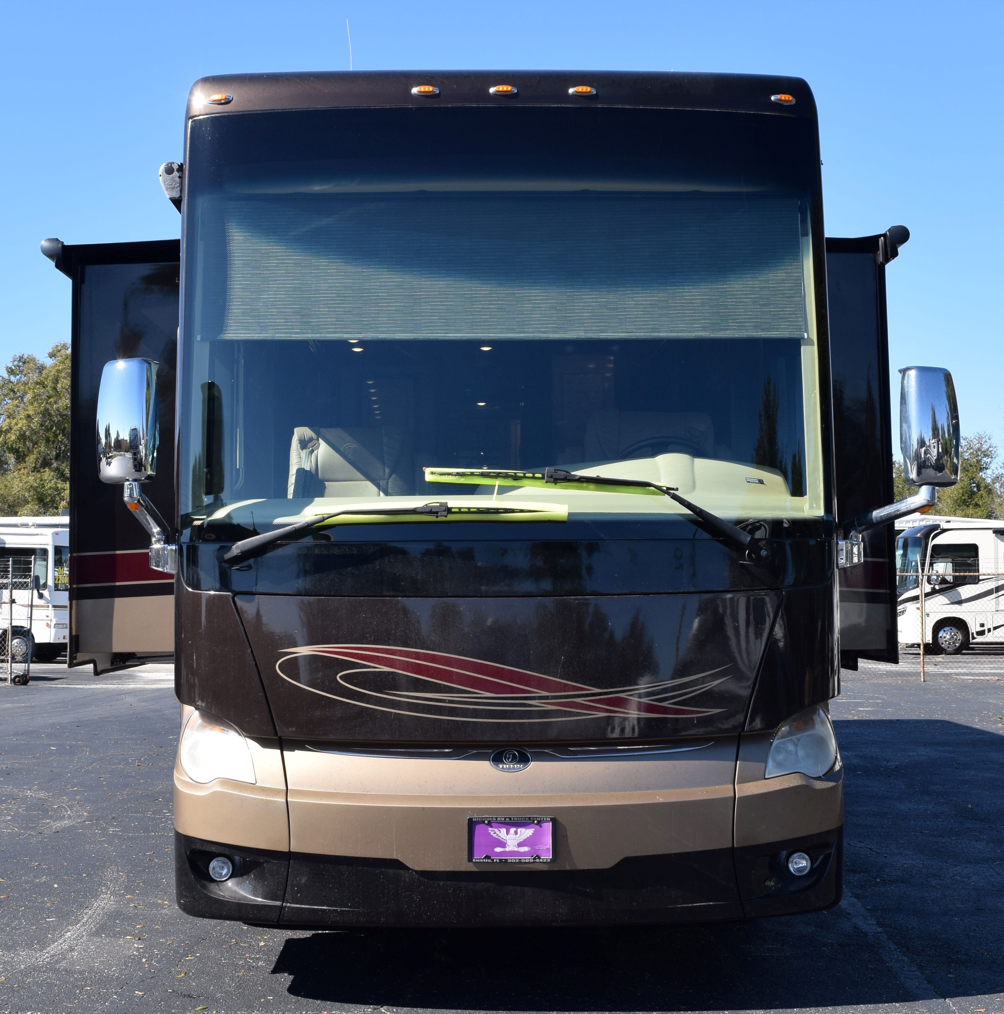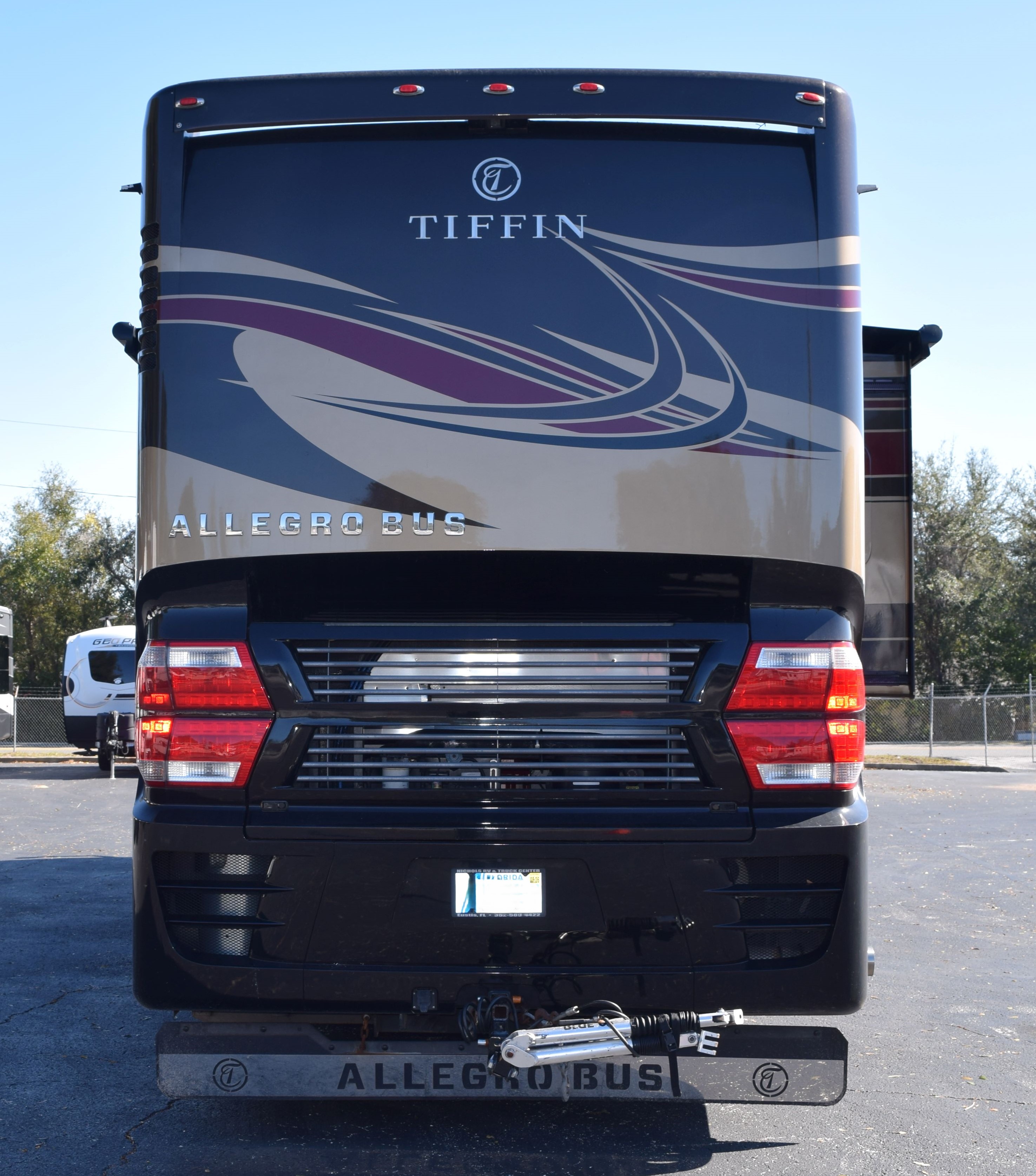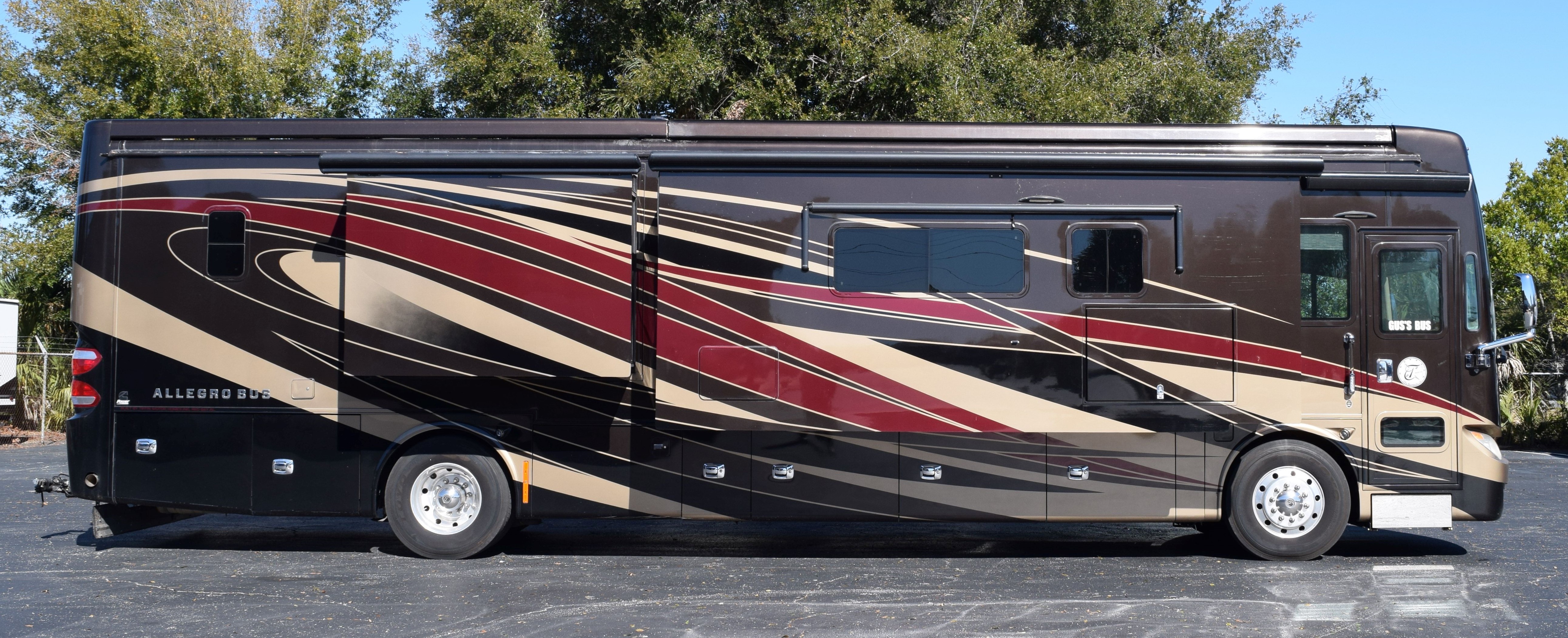 Make way for this magnificent coach! This 2016 Tiffiin Allegro Bus (M-40SP) will allow you to travel the states in luxury and style. Seated on a Powerglide chassis and powered by a Cummins 450hp engine with Allison transmission, this diesel coach will not disappoint. The current mileage is only 36,245 miles. Once you step into this Rustic Canyon colored coach using its powered entrance step, you are welcomed by the beautiful basket weave tile floors, watercolor interior, and glazed canyon cherry hardwood cabinetry. The living area is furnished with a luxury recliner, entertainment center with fireplace, spacious AirCoil Hide-A-Bed sofa that converts to a bed, and dinette comp work station. This kitchen for this coach can only be described as remarkable with its tile backsplash and solid surface countertop with pull-out extender. The space is also equipped with a dual sink with matching covers, pull-down single handle kitchen faucet, dual burner portable cooktop, dishwasher, twin pull-out pantry with adjustable shelving, and tons of storage space options. All of the major appliances are residential stye, which includes a microwave/convection oven, three-door french door style fridge/freezer with ice maker and water dispenser, and two-piece stacking washer and dryer (located in the main bedroom housed in the glazed white chocolate water closet). There is also a half bath at the edge of the kitchen to make traveling all the more convenient. The main bedroom area is extremely spacious and houses a king-size Air Comfort bed and lots of closet space with safe for locking away valuables. The bed also raises for additional storage. The full, en-suite bathroom includes a glass radius shower enclosure and single vanity with even more storage opportunities. All windows are shaded with day/night shades, and the windshield has its own powered privacy and sun shade. The interior of the coach is also fitted with three flat screen TVs, two blu-ray DVD players, overhead ventilation system, map lights, and a power step cover. All of this is powered by a 50AMP service with powered rewind reel. There is also an 10.0kW Onan diesel generator with auto start as an additional power source. The exterior of of the coach is just loaded as the interior. The roof is fiberglass and houses three Coleman rooftop A/C units with heat pumps. There is a total of three slide outs on this 41ft coach, all in which have slide out toppers. Three more additional manual window awnings can be found around the exterior for the frameless dual-paned tinted windows. The coach also has a powered Paramount main patio awning, as well as a main entrance awning. The basement pass-through storage compartments are all illuminated and equipped with both carpet and trays for ease of storage use. Other awesome features of this unit include an air leveling jack system, hydraunic heating system, tow hitch with Blue Ox tow bar, security and accent lights, and water heater. Come by to see this beauty for yourself, or call today with any questions or inquiries! 352-589-4422